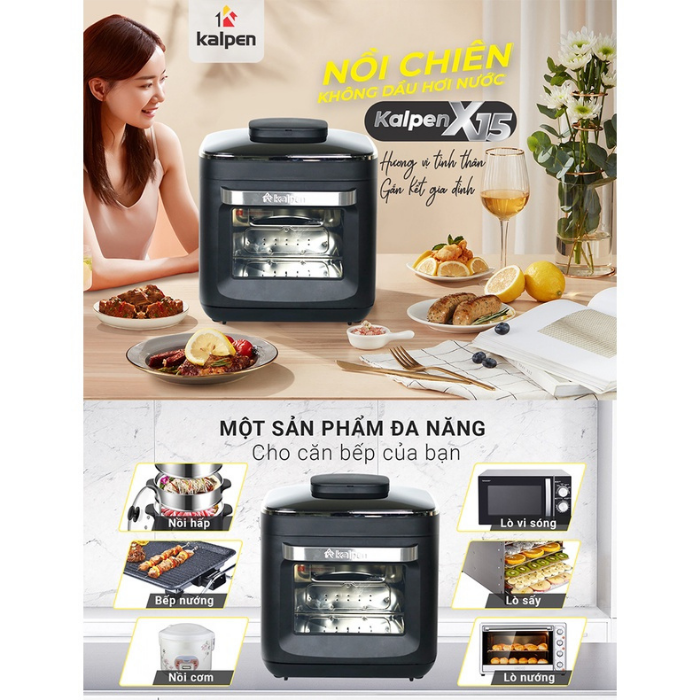 Xin giới thiệu Siêu phẩm mới Nồi Chiên Không Dầu Hơi Nước Kalpen X15, là bước đột phá với công nghệ Steam Frying, giải quyết vấn đề khô mất chất của đồ ăn khi chiên. Đạt kết cấu hoàn hảo 5 sao, thêm giòn, ngon ngọt cho mỗi món ăn của bạn bằng cách kết hợp Chiên Hấp trong một chiếc nồi. Qua đó tạo ra những thành quả tuyệt ngon. Giúp bạn thưởng thức các món ăn, đồ ăn nhẹ và món tráng miệng... thêm hấp dẫn. Công nghệ Steam Frying tiên tiến của chúng tôi sử dụng áp suất phù hợp cung cấp đủ độ ẩm trong khi vẫn giữ lại các vitamin và chất dinh dưỡng trong thịt gà, thịt, khoai tây, rau và cá của bạn.. Khay nước chất liệu cao cấp, được đúc khuôn độc nhất vô nhị của chúng tôi mang đến cho thịt của bạn hương vị tuyệt vời và hoàn hảo. Tiện lợi nhất là dung tích lớn nhất từ trước đến nay chứa được tới 15 lít thực phẩm, được coi như một loại nồi chiên không dầu size XXL. Giờ đây, bạn dễ dạng phục vụ một bữa ăn thịnh soạn cho đủ 8 người. Giảm tới 99% chất béo, giúp bạn có một chế độ ăn uống lành mạnh hơn. Tăng hương vị cho các món ăn, ít calo hơn cho sức khỏe và thêm lựa chọn cho việc nấu nướng. Kalpen tự hào giúp cuộc sống của bạn dễ dàng, thông minh và lành mạnh hơn.